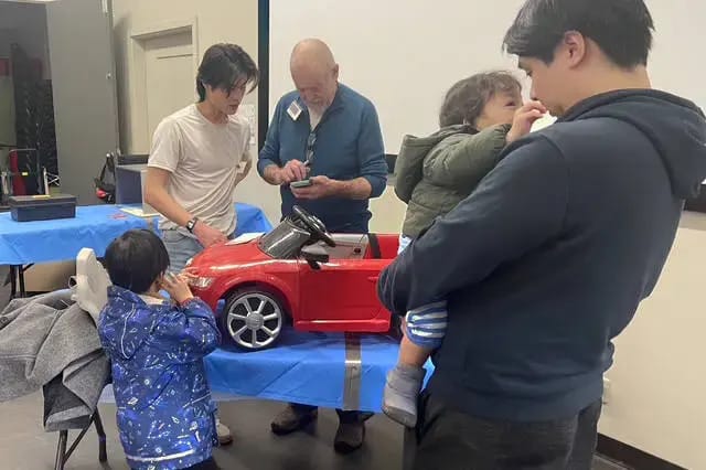 A family waits for repairs to a young member’s toy car, during a previous Repair Café at Alex House in South Surrey.